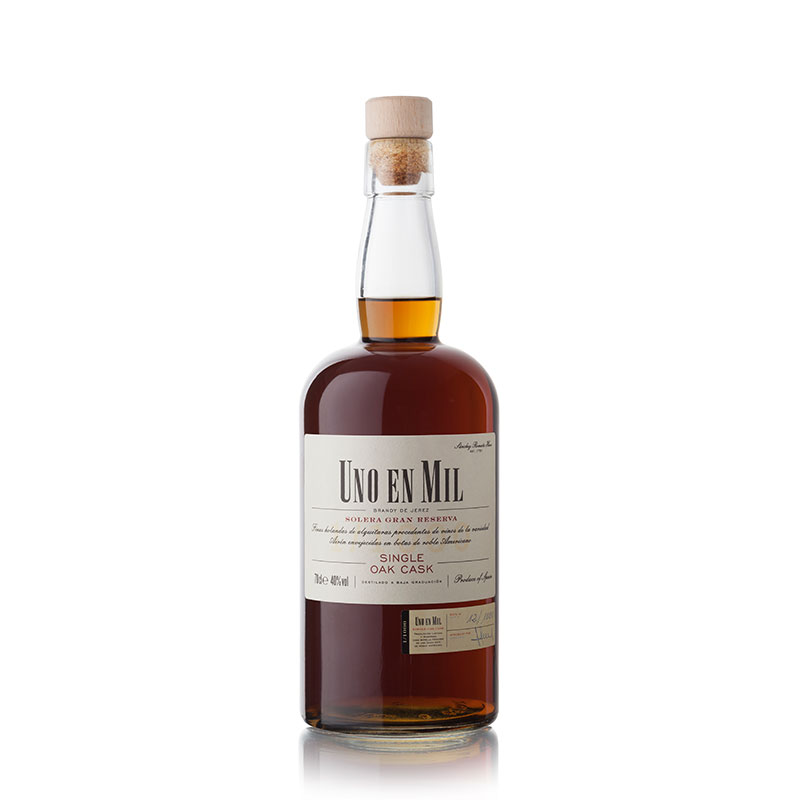 Suave, delicado, complejo y sorprendente. Con Uno en Mil, la tradición del exclusivo brandy Solera Gran Reserva llega al gusto del presente. Su propio nombre atestigua su unicidad y excepcionalidad. Cada botella está numerada haciendo referencia a su origen, una de las mil botellas de exclusivas holandas, envejecidas estáticamente durante doce años. Este proceso de envejecimiento, denominado “Single Oak Cask”, aporta matices íntimamente particulares, refinados, exigentes y absolutamente identificados con el paladar actual.